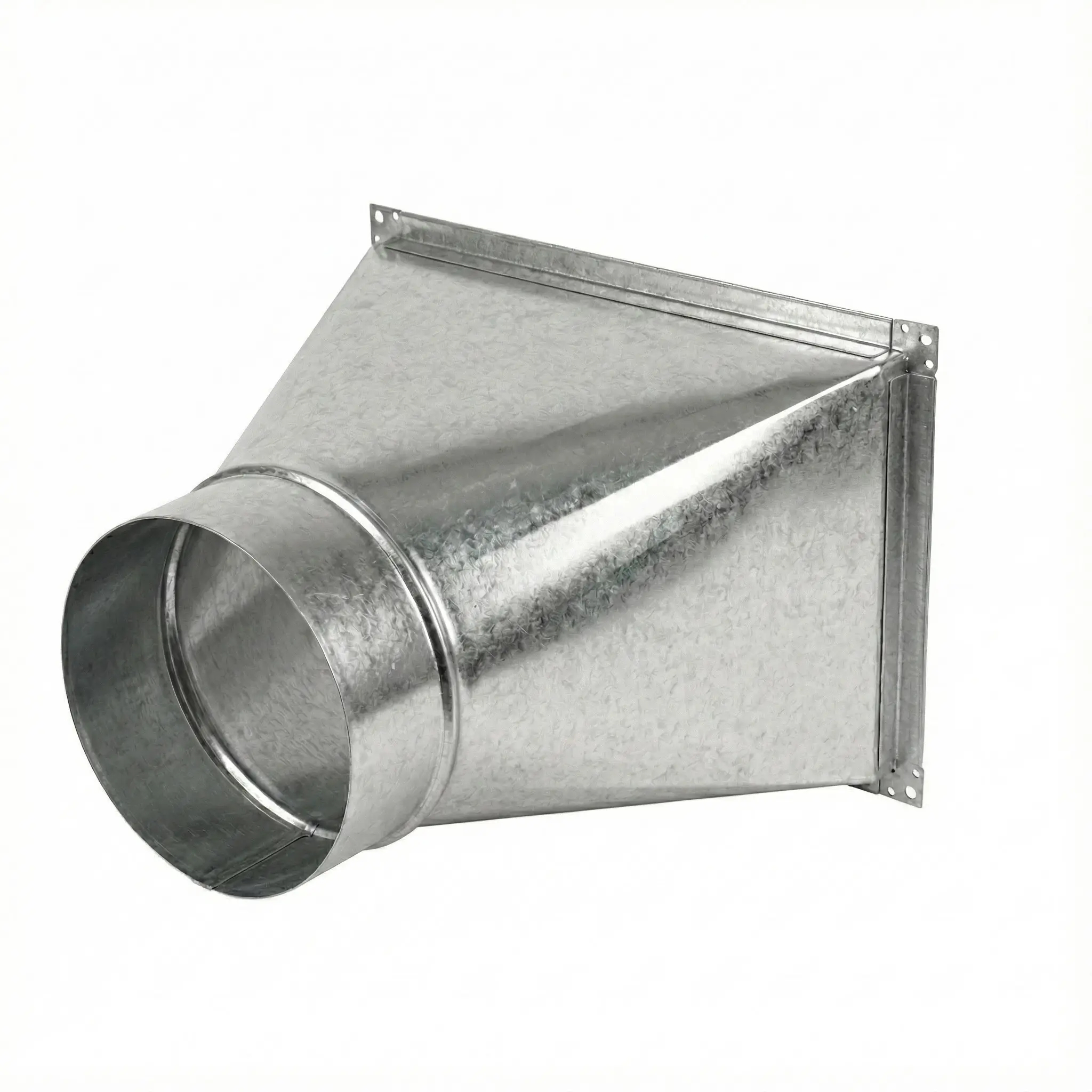 Переход прямоугольное сечение на круглое применяется для соединения участков вентиляционной сети различной формы. Изделие обеспечивает герметичную стыковку прямоугольного воздуховода с круглым каналом без утечек воздуха и с сохранением проектной конфигурации трассы.